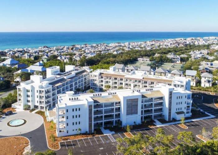 Located at the entrance to Hwy 30A in Inlet Beach, the two- and three-bedroom vacation rentals feature open floor concept allowing guests plenty of room to gather in the kitchen and living room spaces. Bedrooms are furnished with king- and queen-sized beds and feature attached private bathrooms and Restoration Hardware finishing touches. Private balconies overlook the beautiful pool setting in the center of the property.
